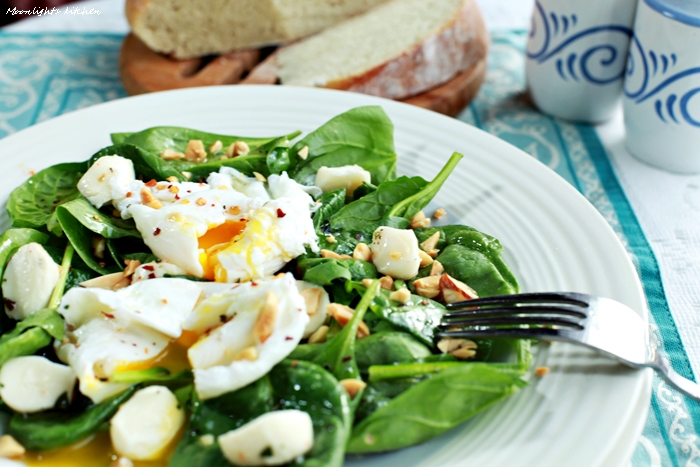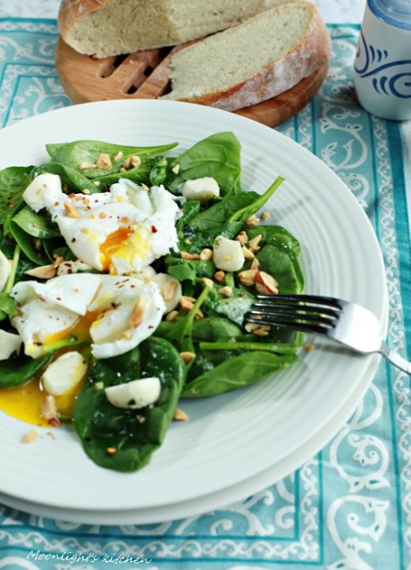 Vì nhà còn nửa ổ bánh mỳ nên tối nay mình làm bữa tối giản đơn với Poached eggs và cải bó xôi nhí trộn dầu giấm. Thêm 1 ít pine nuts với mozzarella cheese tươi nữa. Thế là mình có món ăn mới 1 cách tình cờ 🙂