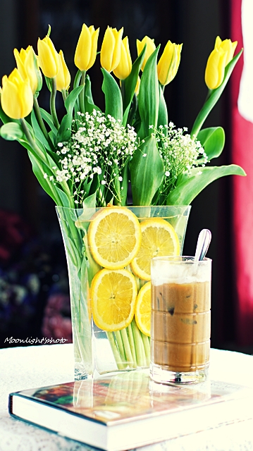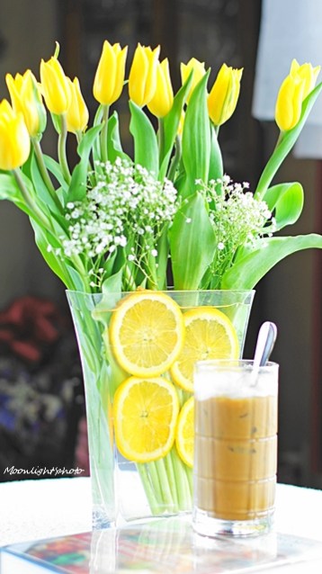 Mùa này hoa tulip đang nở rộ nên nhà mình tuần nào cũng có bình hoa tươi thế này. Yêu lắm í 🙂