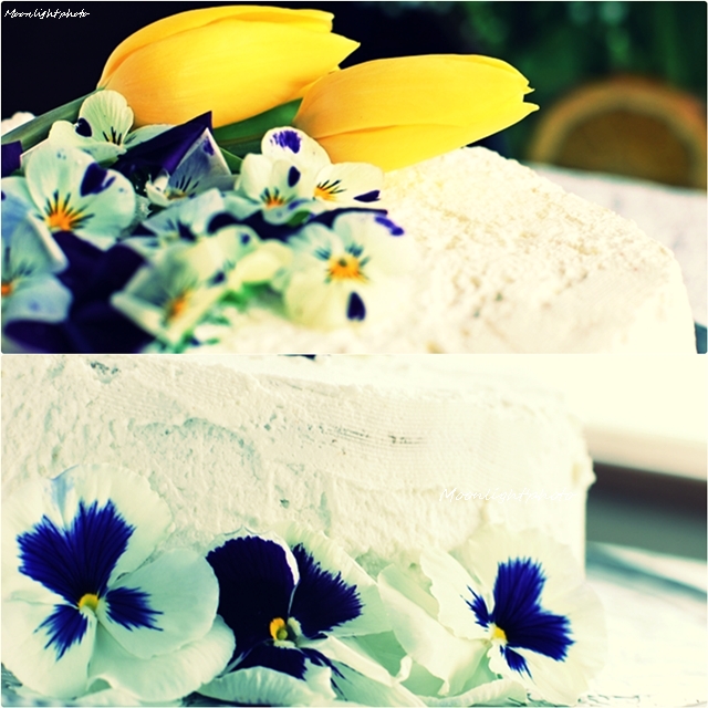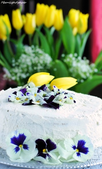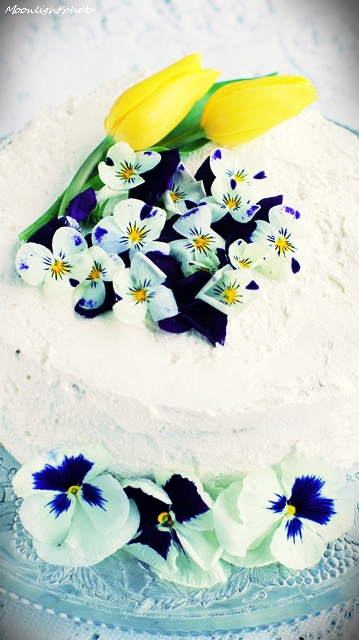 Mình vốn kém cỏi trong việc bắt kem lên bánh nên mình dùng hoa Viola có sẵn trong vườn nhà. Hoa này mọi người dùng làm salads cũng rất ngon đấy ạh